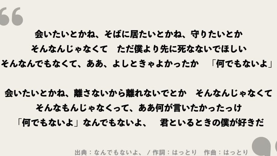 「なんでもないよ」の歌詞は、日常生活の中で感じるさまざまな感情を掘り下げています。この曲では、特に小さな出来事や些細な瞬間が大切であることを強調しており、そのメッセージは多くのリスナーに深い共鳴を与えています。具体的には、孤独感や喜びといった相反する感情が巧みに表現されており、それが聴く人々の心に響きます。私たちはこの曲を通じて、人々が自身の日常に見出す価値について再考するきっかけになることを願っています。